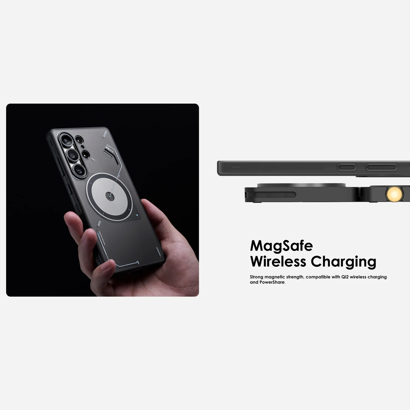 Does the AULUMU Frosted Case for Samsung Galaxy S25 Ultra (Cooling Tech, Color Changing Sensor, Glow in The Dark) support MagSafe and wireless charging?