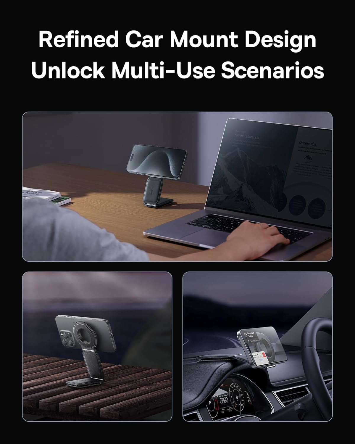 360° rotatable base and two-axis foldable design Universal compatibility with extra magnetic rings High-quality metal and leather craftsmanship