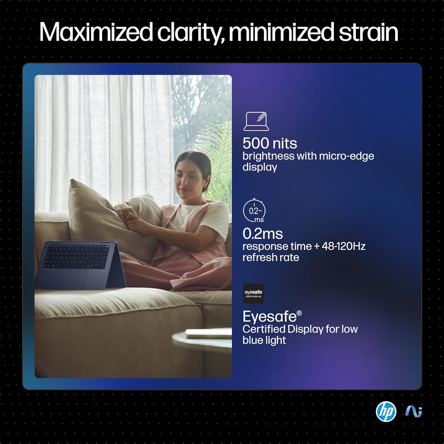 HP OMNIBOOK ULTRA FLIP 14-FH0013DX brings balanced speed with Core Ultra 7 256V, 16GB DDR5 ON BOARD/1TB NVME, Discrete graphics, and a bright 14″ 3K (2880 x 1800.