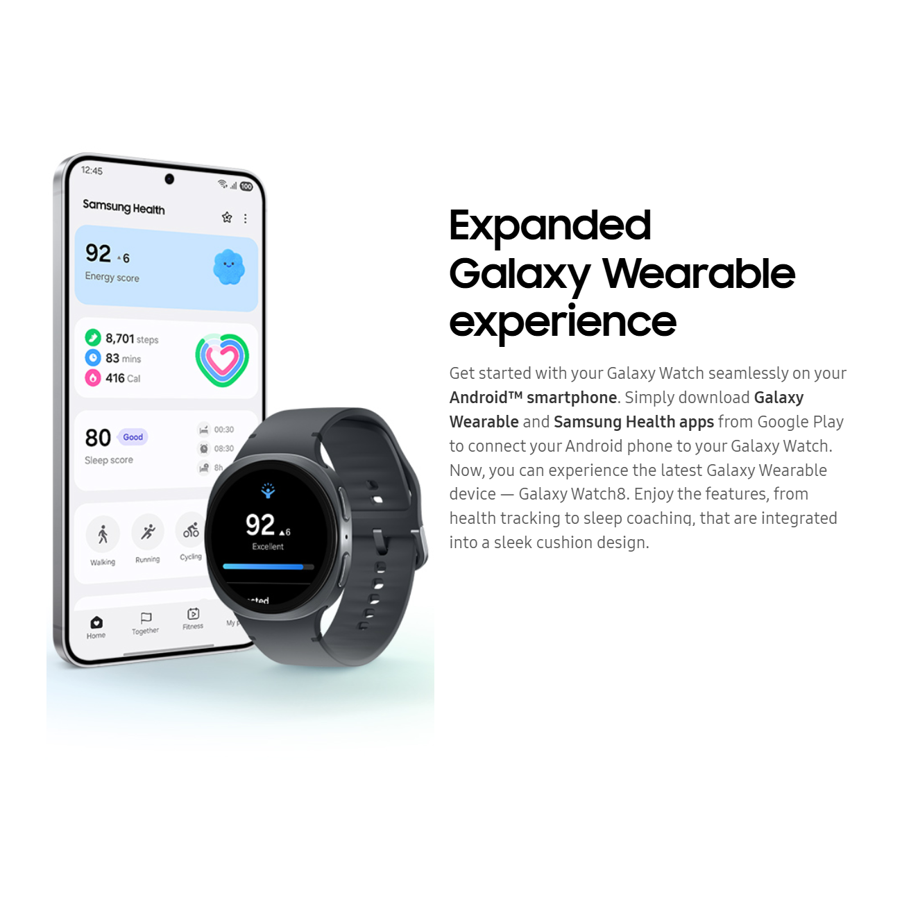 Experience next-generation innovation with the Samsung Galaxy Watch 8, available in 40mm, 44mm, and the timeless Galaxy Watch 8 Classic 46mm. Engineered for performance and style, these smartwatches deliver comprehensive health tracking, advanced fitness features, and seamless integration within the Galaxy ecosystem. Whether you prefer the sleek, compact form of the 40mm, the balanced size of the 44mm, or the premium, rotating bezel of the 46mm Classic, the Galaxy Watch 8 series offers a perfect fit for every lifestyle—powered by Wear OS and built for everyday durability.