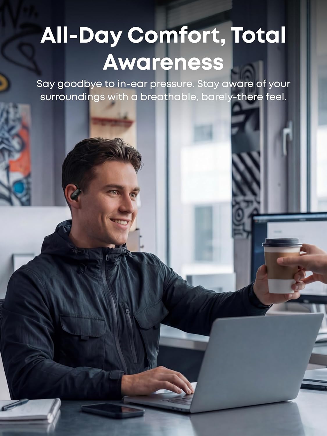 - Adjustable Open-Ear Comfort: Features a unique 4-position adjustable ear hook that conforms to over 99% of ear shapes, eliminating the pressure of in-ear tips while securing the buds firmly in place.