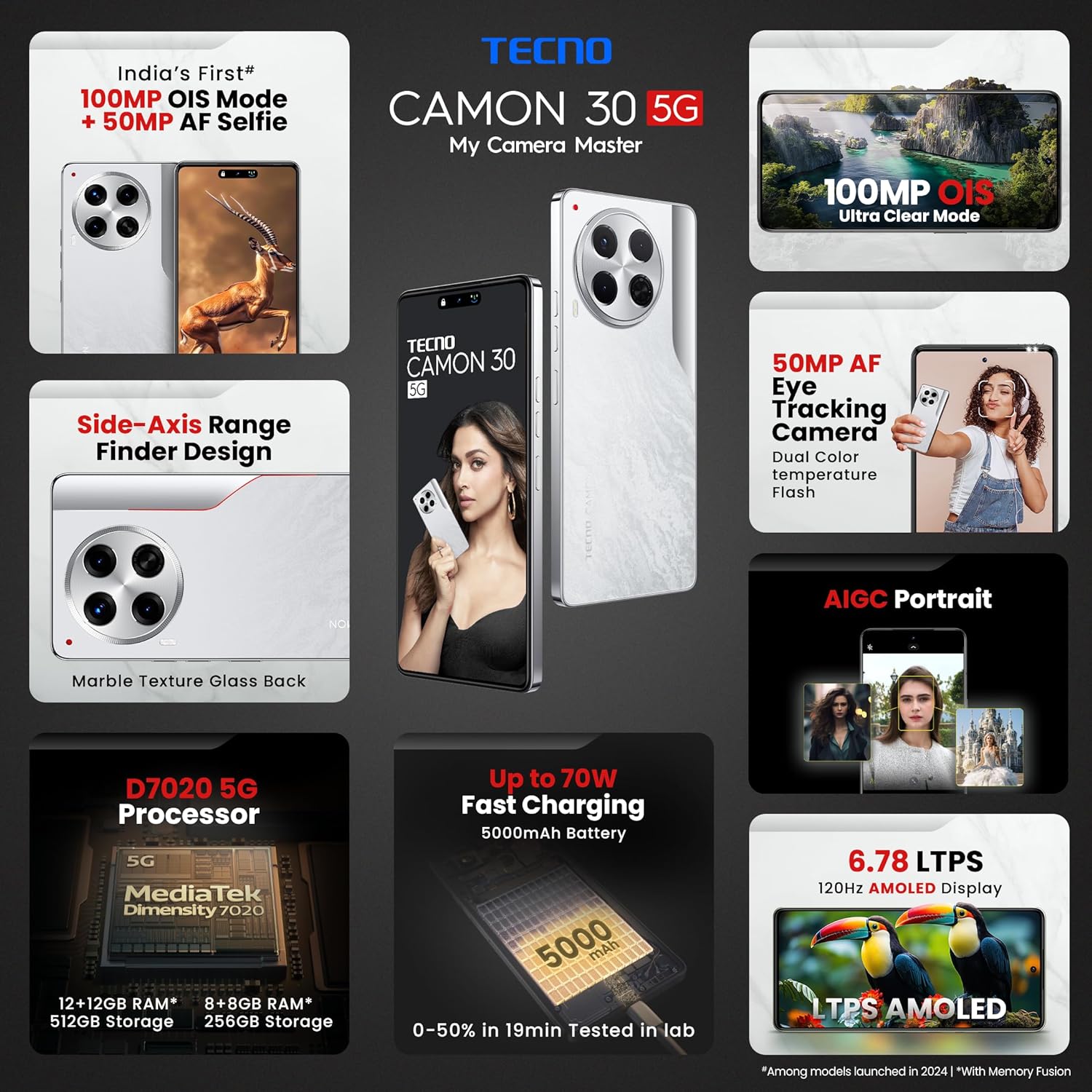 Tecno Camon 30 5G 12GB/512GB (100MP OIS Camera, 50MP Auto Focus Selfie, 6.78-inch AMOLED Display, Dimensity 7020, 5000mAh and 33W Charger)