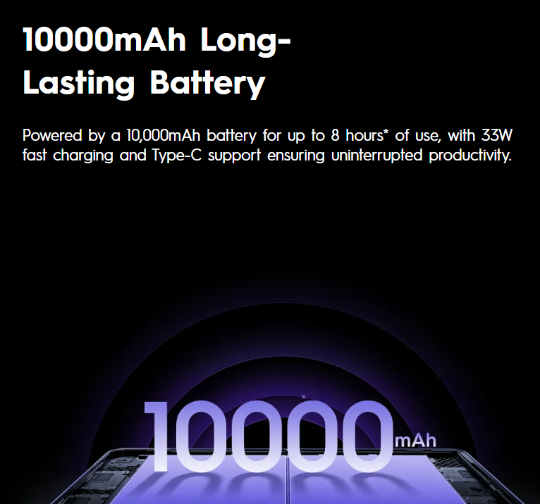 - Battery: 10,000 mAh high-capacity battery for long daily use, with 33 W fast charging via USB-C.